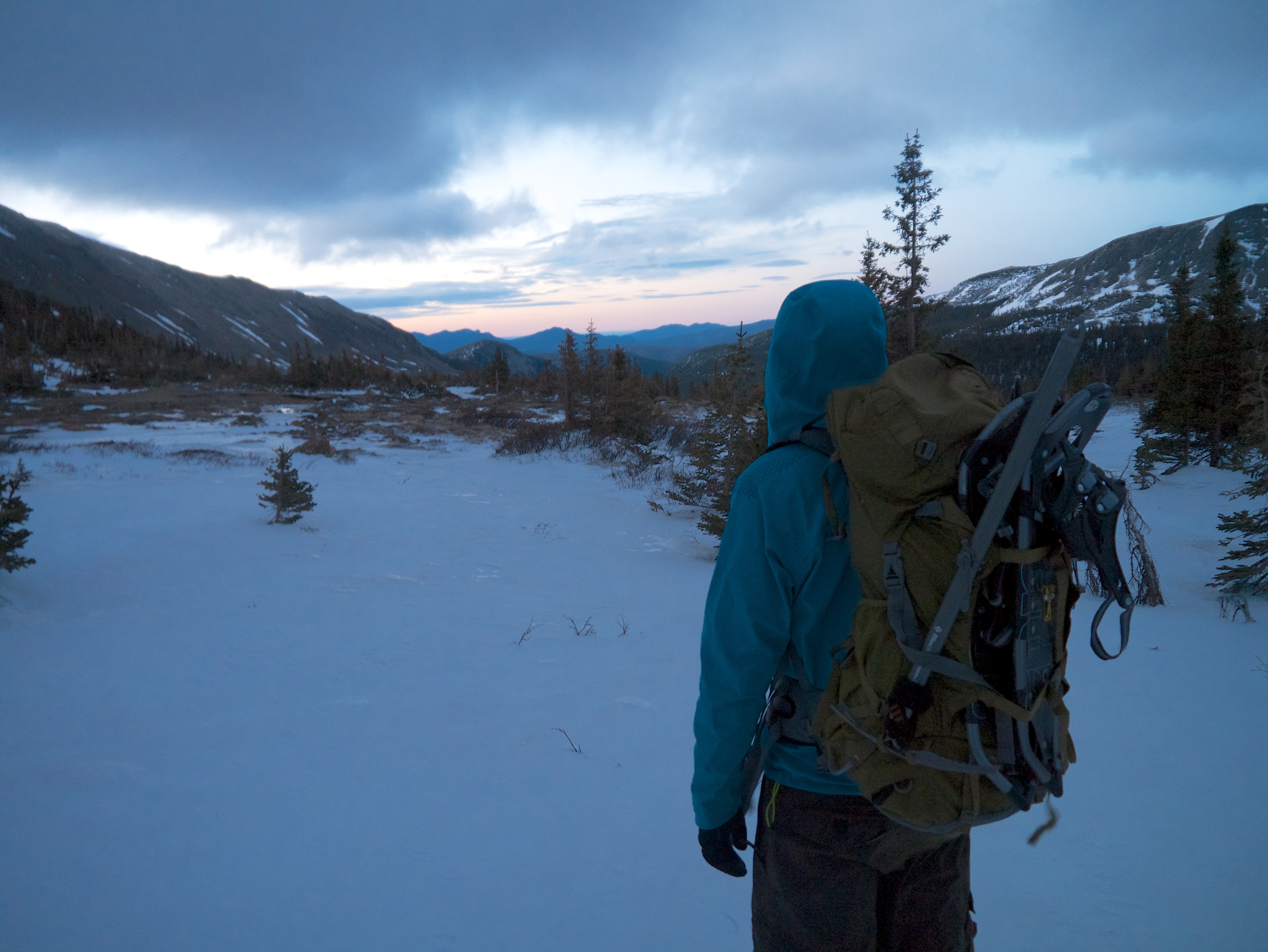 All to soon we were up and cramming our feet into mountaineering boots, and shouldering packs. We hit hard packed snow almost immediately after leaving the trailhead. Thankfully snowshoes were not needed, but the snow did make route-finding in the dark a bit challenging.