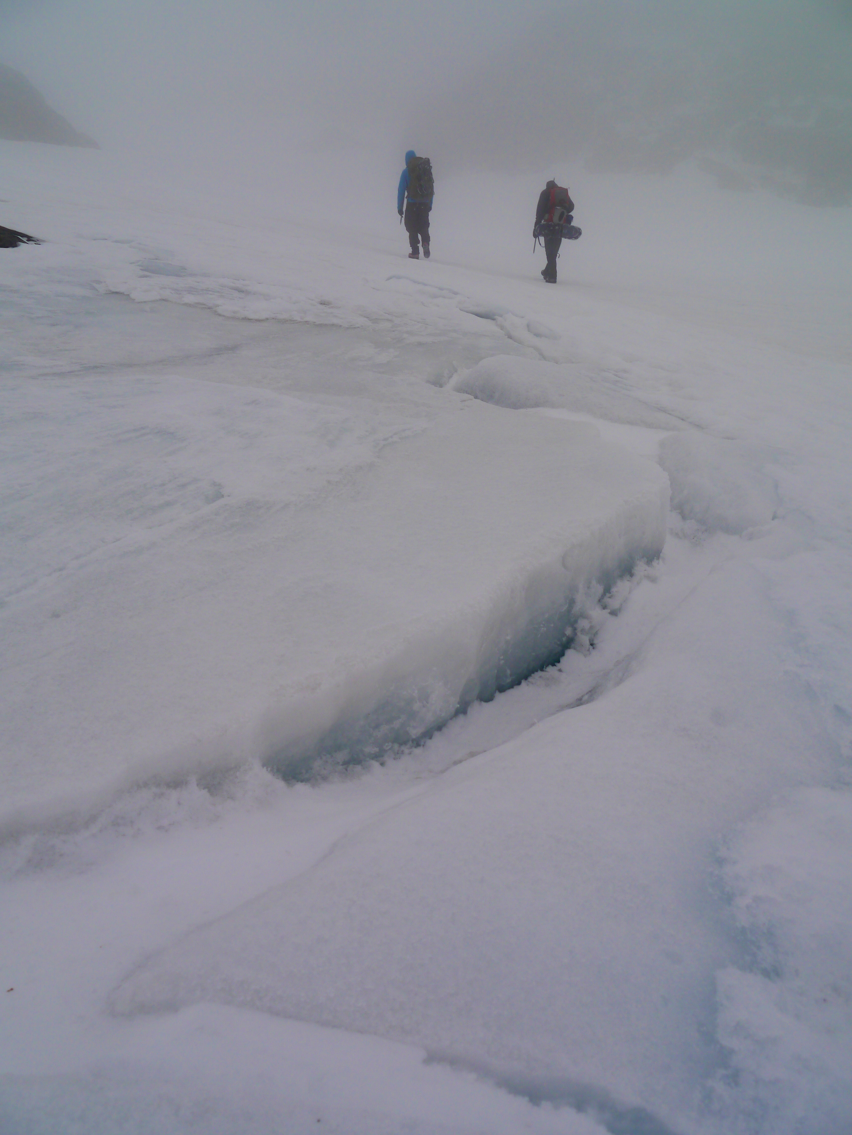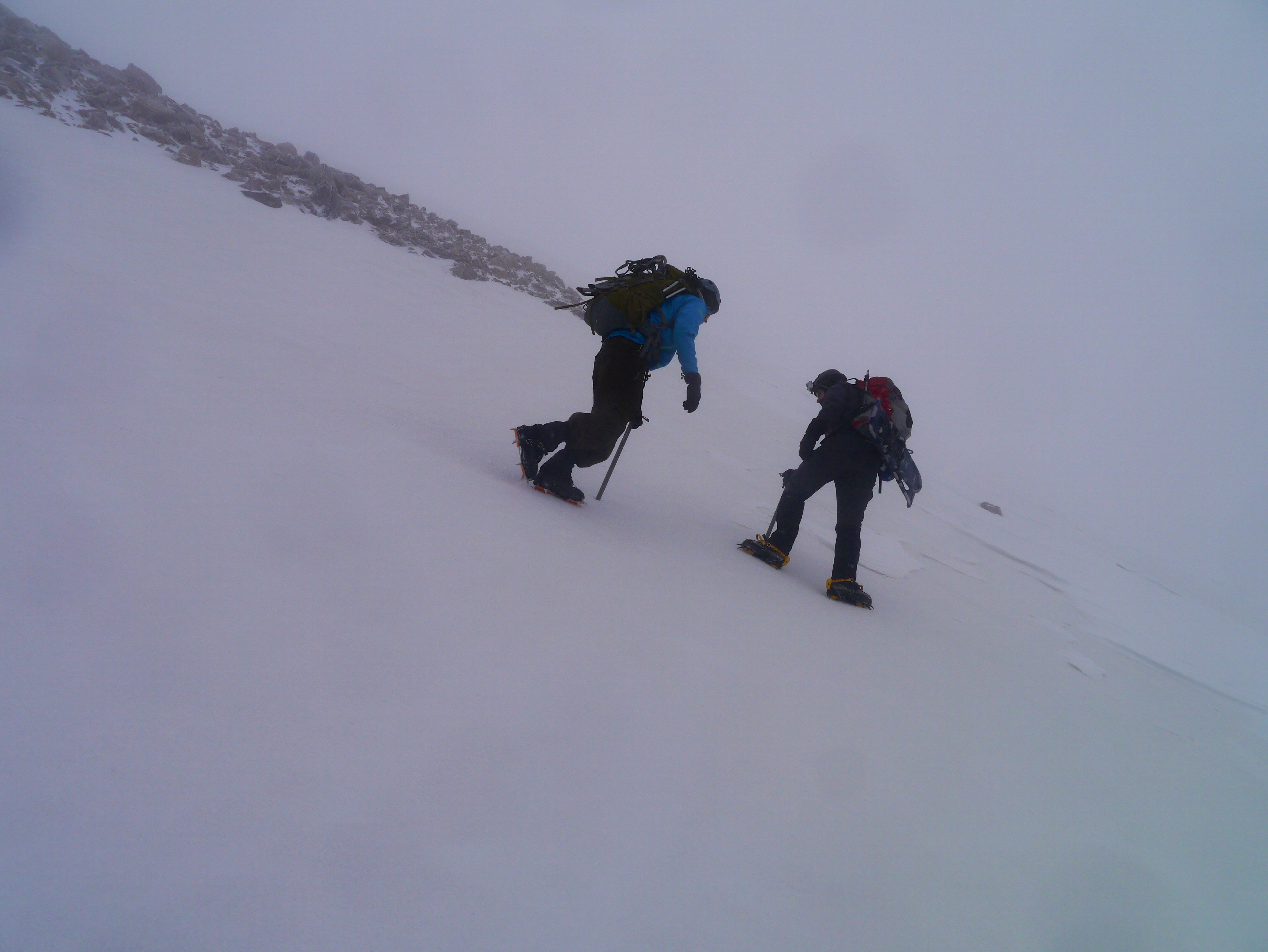 We slowly picked our way towards the base of the couloir. We had to rely solely on a GPS route I had drawn in google earth. We were unable to see the mountain at all to pick the correct couloir.